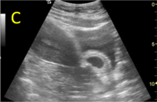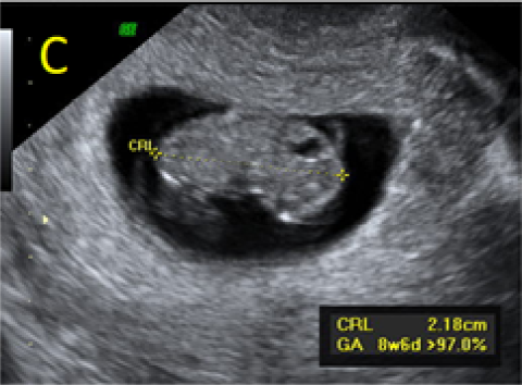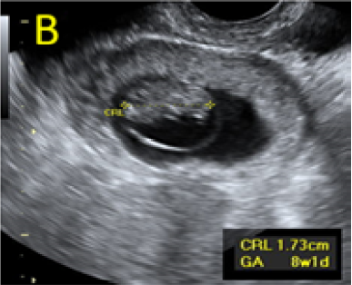 Figure 1. A: the gestational sac is located at the level of the uterine isthmic scar, grey-scale and Power Doppler transvaginal evaluation. B: an embryo with a crown-rump length (CRL) that corresponds to 8 weeks and 1 day is found with normal fetal heart activity (C).
