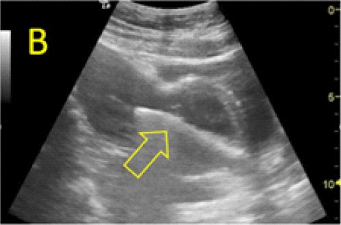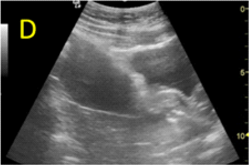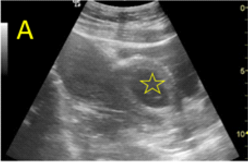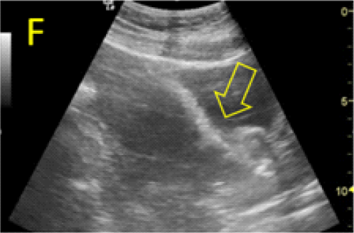 Figure 5. Cervical dilation and pregnancy aspiration performed under transabdominal sonographic guidance. A: the appearance before the procedure, the gestational sac bulging in the urinary bladder is marked with open star. B:Cervical dilation, the metallic Hegar dilator is indicated with open arrow. C, D: progressive aspiration of the pregnancy. E, F: translation of the posterior bladder aspect (open arrow) inside the isthmic uterine segment, through the pregnancy scar area, at the time of aspiration.