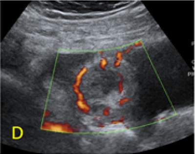 Figure 2. A, B: empty uterine corpus and the presence of the gestational sac at the level of the previous cesarean scar, transabdominal assessment. C, D, E: Same approach, evidence of bulging of the gestational sac into the urinary bladder, with hypervascularity highlighted using Power Doppler evaluation.
