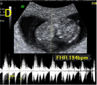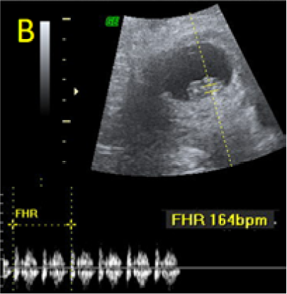 Figure 3 – Ultrasound evaluations on Day 3 (A, B) and 7 (C, D) after MTX administration, with B-hCG values of 103.016 and 57.710mUI/ml, respectively. Fetal growth and normal heart activity is present.
