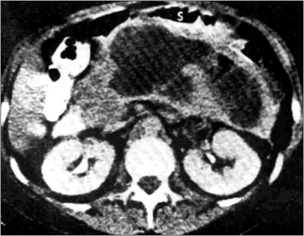 This is the case of a 44 years old male patient admitted in our institution for abdominal pain and palpable epigastric tumor. Six months before the current admission the patient was hospitalized and treated conservatively in another hospital for an episode of acute severe alcoholic pancreatitis.