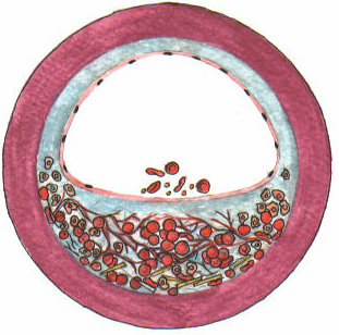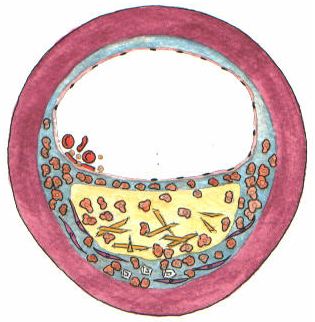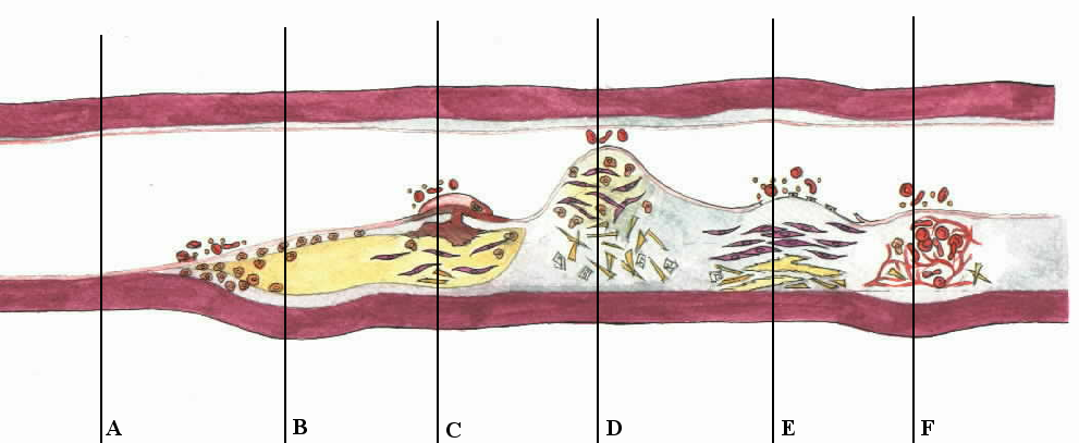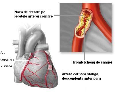 Stratul fibros ce acoperă placa de aterom se poate rupe sau fisura — hemoragii — activare plachetară și formarea fibrinei – formarea locală a trombului care limitează suplimentar fluxul de sânge la nivel coronarian.