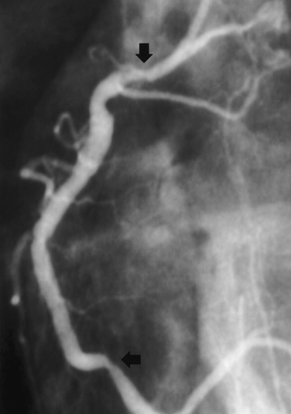 Injectarea în CD – deficit de umplere la nivelul segmentului mediu, fără limitarea fluxului, posibil tromb sau disecție spontană (necesită IVUS sau OCT);